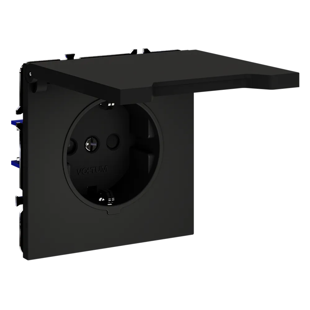 Благодаря степени защиты IP40 и наличию крышки, розетка надёжно защищена от проникновения твёрдых частиц и брызг воды, а встроенные шторки предотвращают доступ детей к контактам. Это делает изделие одним из самых безопасных в линейке Voltum.